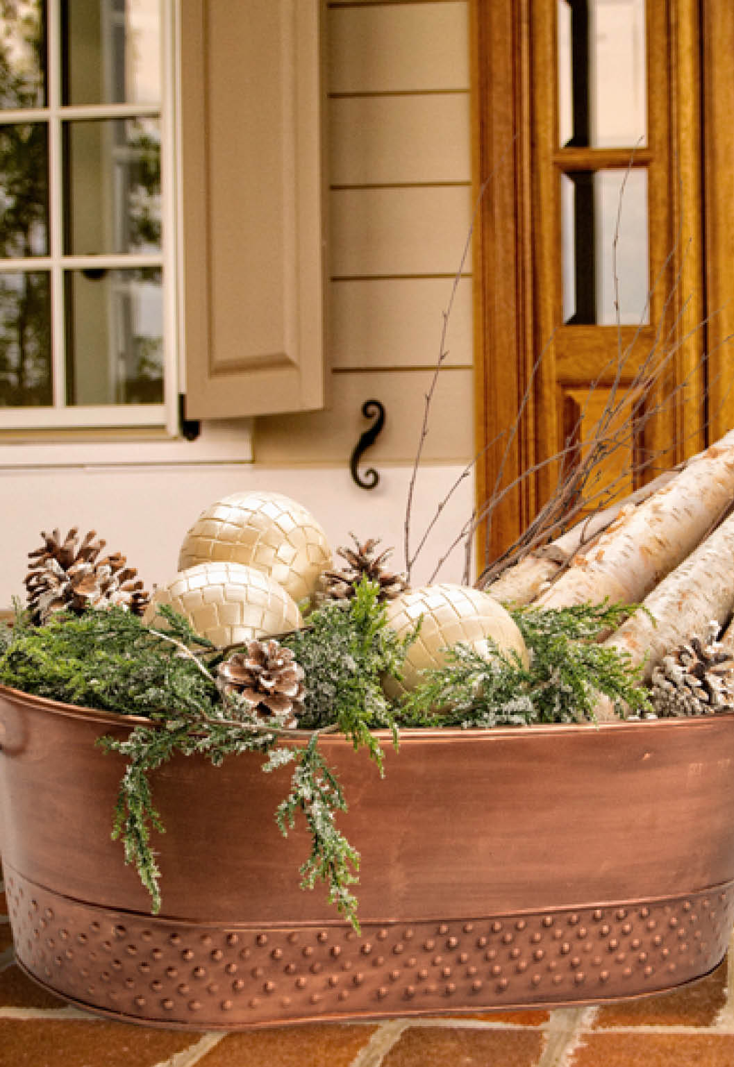 In the winter, switch out your traditional autumn colors with all white items, and frost the pinecones from your fall decor to bring the holidays to your doorstep; add a touch of green with some pine branches, which will also welcome guests with the scent of the season.